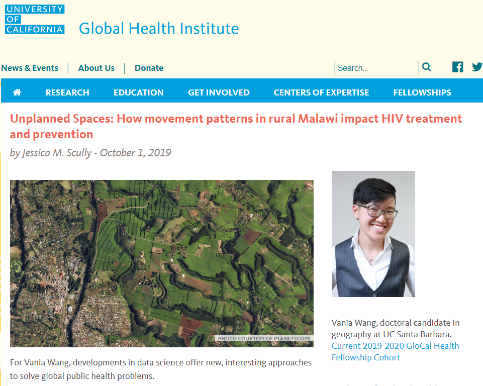 Wang is a doctoral candidate in the Department of Geography at UCSB and the first GloCal Health Fellowship from the University of California Global Health Institute (UCGHI). She works with professor Susan Cassels.